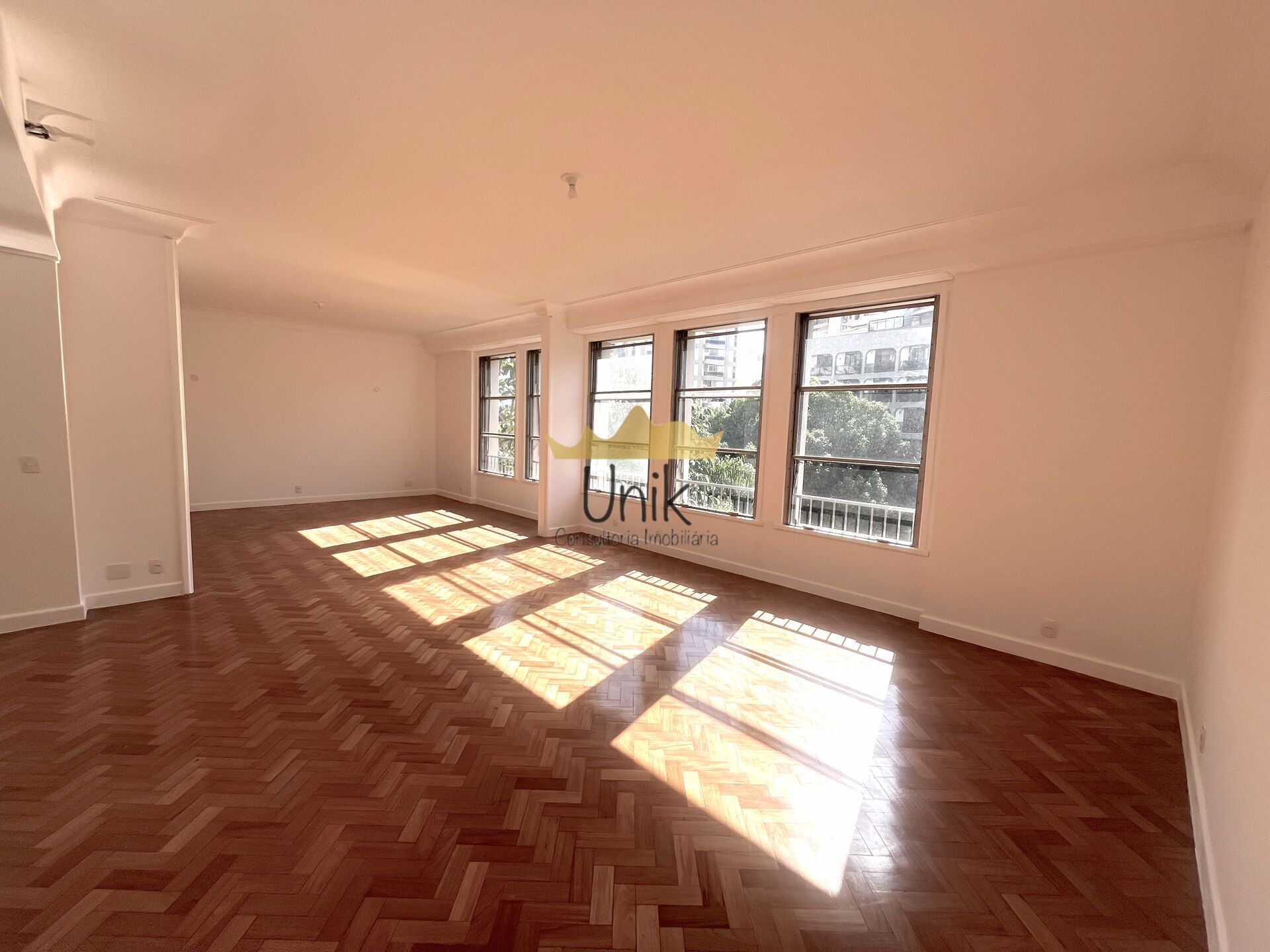 Sala muito ampla com janelões de ponta a ponta e vista livre para a Av. Visconde de Albuquerque. Após a sala, hall com acesso ao lavabo, à cozinha e área íntima que conta com mais uma sala grande e bem iluminada por ter janelas em dois lados. Essa sala pode facilmente ser revertida em um terceiro quarto. Seguindo o corredor, dois banheiros amplos completos e mais um hall para acesso aos dois quartos. Nesse hall, existem armários embutidos. O maior dormitório tem cerca de 100m2 e conta com estante instalada e armários embutidos de ponta a ponta em uma das paredes. O outro quarto é muito bom e conta também com armários embutidos. A vista de ambos é para o lindo jardim interno do condomínio, nos fundos, o que faz serem bastante silenciosos e tranquilos.