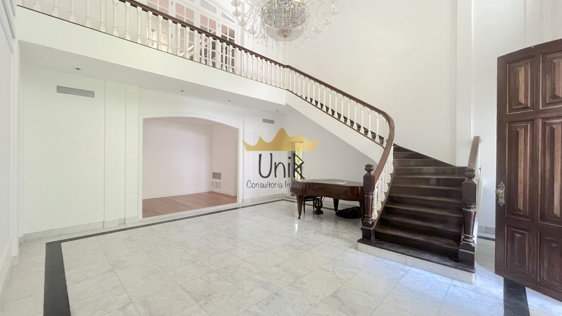 Ao entrar somos recepcionados por um lindo jardim com um lago com fonte e vemos a varanda frontal da casa com grande porta em madeira. Ao entrar na casa, percebemos o pé direito altíssimo, o majestoso lustre em cristal, que foi projetado em Portugal para aquele ambiente, e o lindo piso em mármore. Vemos ainda a linda escada em madeira e mármore e sacada ao alto. Seguindo em frente chegamos nas salas de estar e de jantar, ambas com piso em tábua corrida e com portas debruçadas na área de lazer, que tem um lindo jardim, piscina, edícula com churrasqueira completa, spa com sauna, chuveirão, sala para massagem e banheiro. Ainda no andar térreo encontramos um lavabo, um escritório, um quarto, a copa repleta de armários, a cozinha e a despensa.