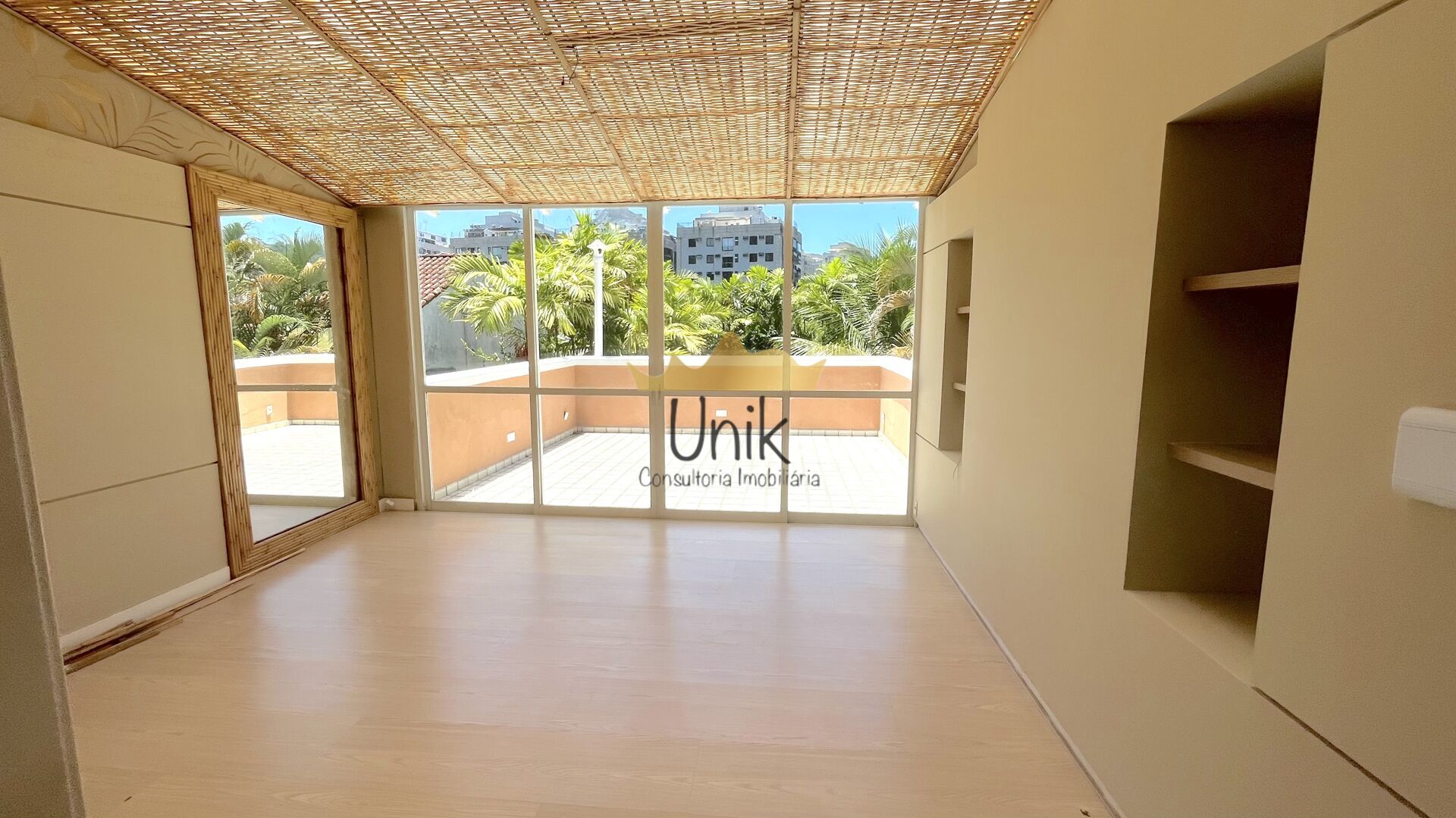 No terceiro andar, mais áreas de lazer. Na parte fechada, uma sala com bar e banheiro e duas varandas externas, uma delas com cozinha gourmet e deck em madeira.