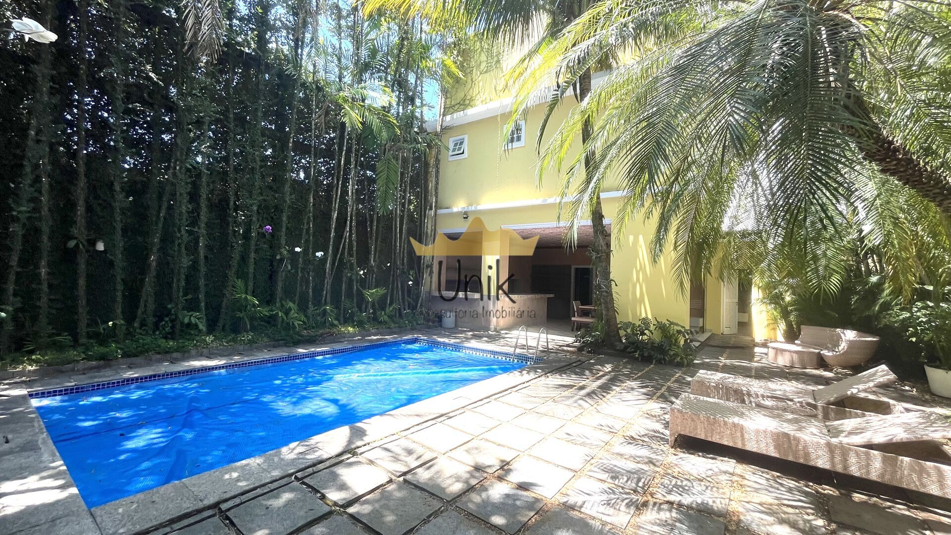 Na parte de trás da casa, encontramos três quartos de empregados e dois banheiros, uma lavanderia espaçosa e uma brinquedoteca com pátio em grama sintética e piscina de bolinhas.